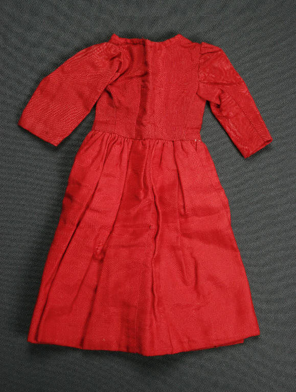 Abito di tessuto rosso con fodera di tela rosa; presenta un' arricciatura e delle pinces sul davanti. La parte superiore è foderata in tessuto grigio con apertura posteriore.