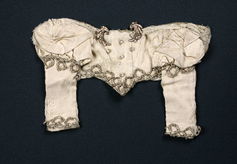 Il corpetto è realizzato in seta avorio con fodera di tessuto verde. Le maniche sono a palloncino e sul davanti termina a punta. E' decorato con passamaneria argento sull'orlo, ai polsi e sotto gli sbuffi delle maniche. La decorazione è completata da strass e due orecchini, applicati come decorazioni, tempestati di strass.