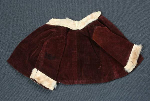 La giacca è di velluto color vinaccia con fodera di garza viola, tinta. Collo e polsi sono di pelo animale, lapin, bianco.