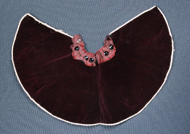 Il mantello circolare, da donna, è di velluto color vinaccia ed ha una fodera di tela bianca con orlo di seta sfilacciata. Il collo è di seta rossa decorato con pietre di vetro strass rosso scuro.