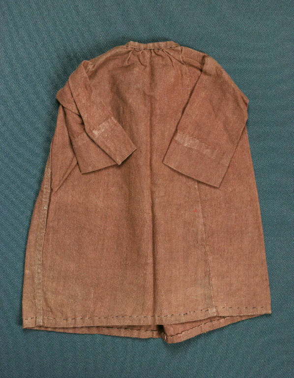 Il saio da frate cappuccino è di cotone marrone tinto con apertura anteriore e leggera arricciatura al collo tondo.