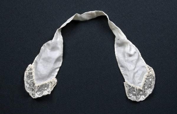 Cravatta di foggia settecentesca realizzata in seta avorio con estremità stondate e decorate con pizzo; la seta è ripiegata e cucita.