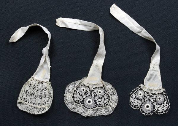 Tre cravatte di seta, di foggia settecentesca, con pizzo cucito ad un'estremità. Due cravatte presentano pizzo identico a motivi circolari di cui una è bordata con altro pizzo più sottile. L'altra ha pizzo di diverso motivo. La seta delle cravatte è ripiegata su sè stessa e cucita e presenta piccoli fori prodotti dai successivi fissaggi agli abiti.