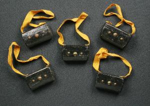 Cinque giberne da carabiniere di legno pieno verniciato di nero con tracolla di nastrino giallo inchiodata con quattro chiodini. Sul davanti sono fissate tre borchie metalliche di ottone, una più grande e due più piccole.