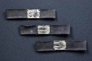 Tre cinture di tela cerata nera foderate di tessuto nero e cucite sul davanti. Sulla cintura è cucita una fibbia di latta rettangolare color argento.