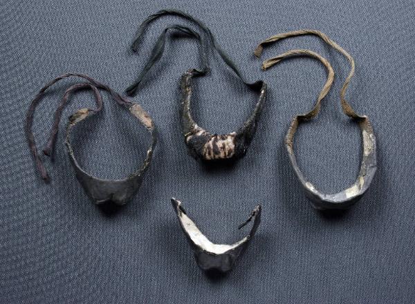Gruppo di quattro barbe finte dipinte di nero a olio, con nastrino nero per allacciarle alle teste dei burattini. Una barba è realizzata in pelle nera intelata ed è ricoperta di folto pelo animale nero. Due sono di cartapesta rinforzata con tela incollata le cui estremità, vicine al nastro, sono ricoperte di radi peli animali. L'altra barba è di cartapesta intelata ed è imbottita internamente con un batuffolo di lana grezza e manca dei nastri.