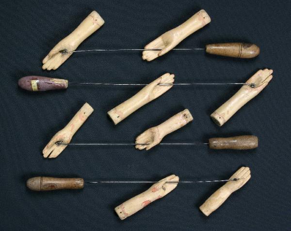 Le mani sono di legno, alcune provviste di una cambretta inchiodata nel palmo alla quale si aggancia la stecca. Hanno le dita intagliate e sono dipinte con colore incarnato naturale piuttosto scrostato sulle dita. Le stecche hanno una manopola di legno nella quale è fissato il ferro.