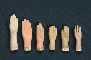 Sei piccole mani per burattino o marionetta (se vi è un foro praticato nel palmo per il passaggio dei fili) di diverse tonalità di colore rosa e dimensioni. Le dita sono intagliate e nella base sono visibili piccoli fori prodotti dai chiodi.