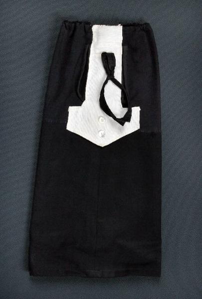 La veste da frack è realizzata in tessuto nero con fodera grigia. Nell'orlo superiore è inserito un cordoncino che consente di fissare la veste al collo del burattino. Sul davanti sono praticati due tagli, bordati con traversino nero, nei quali vengono inserite le braccia del burattino. Sempre sul davanti è applicato lo sparato di cotone bianco con due bottoni cuciti in madreperla. Sullo sparato è cucita e annodata una cravatta nera.