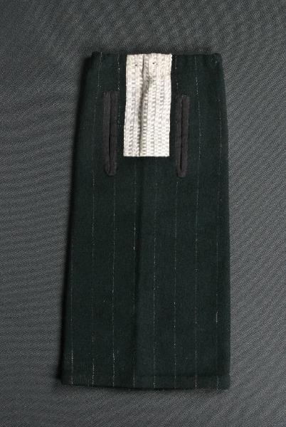 La veste è di tessuto di lana nero a righine bianche verticali. Sul davanti è applicato un rettangolo di cotone grigio a righe verticali in tinta che funge da camicia. Le aperture per le braccia sono bordate con nastrino nero. Nel bordo superiore è inserito un cordoncino per il fissaggio al collo del burattino.