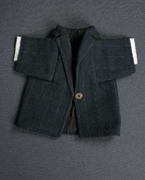La giacca con collo e revers è di tessuto di lana nera con sottili righe verticali bianche. La fodera è di tessuto nero e all'interno delle maniche sono cuciti i polsini della camicia. Sul davanti la giacca presenta un bottone.