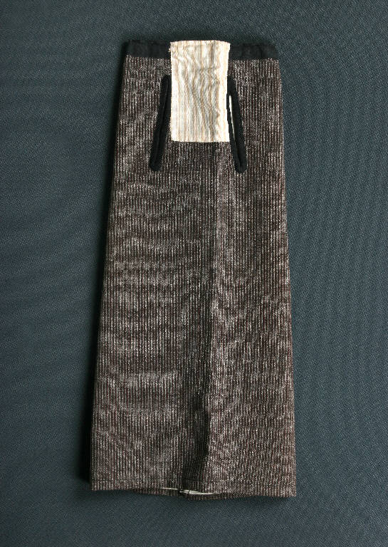 La veste è di tessuto di lana a righe verticali marroni con inserti di filo rosso e grigio. E' realizzato con fodera di tela chiara e nel bordo superiore è inserito un cordoncino giallo per il fissaggio al collo del burattino. Le aperture per le braccia e il bordo superiore sono bordati con nastrino nero. E' applicata una finta camicia a righe verticali bianche e rosa.