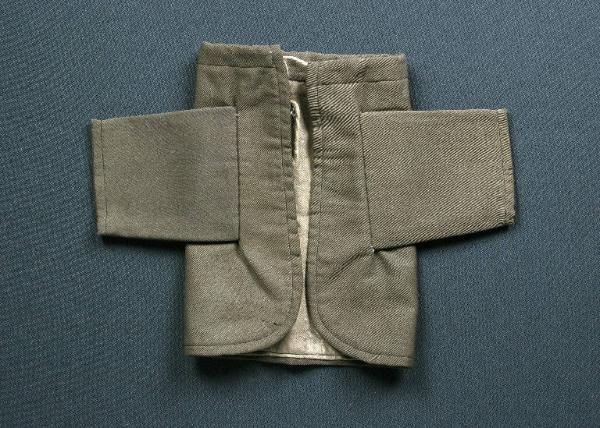 La giacca è di tessuto marrone con fodera marrone più chiaro. La giacca presenta angoli smussati e nel bordo superiore ha inserito un cordoncino per il fissaggio al collo del burattino.
