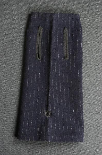 La veste è di tessuto di lana blu con righine verticali bianche sottilissime. Le aperture per le braccia e il bordo superiore sono bordati con nastrino nero. Nel bordo superiore è inserito un cordoncino per il fissaggio al collo del burattino.