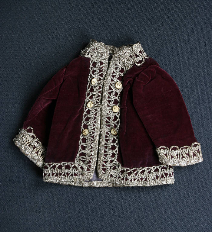 La giacca di vinaccia con fodera viola, bordata con nastro laminato argento e decorata all'intorno e ai polsi con passamaneria argentata. Sul davanti sei bottoncini smaltati bianchi con decorazione dorata, allacciati insieme con alamari d'argento.
