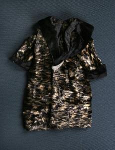 Cappotto di pelo sintetico nero e beige, sfoderato con collo sciallato e polsi di velluto nero. Il collo è foderato con tessuto beige operato.