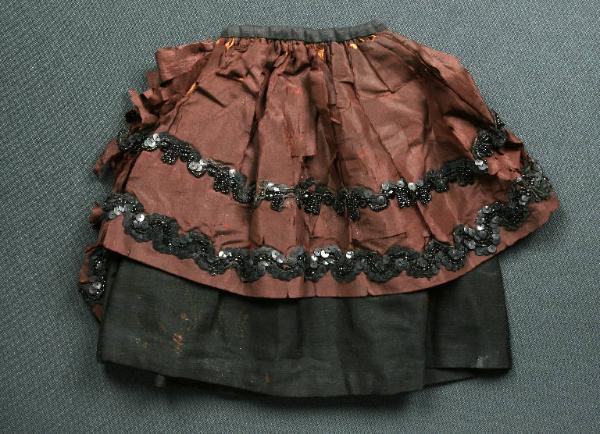 La gonna è di tessuto nero e marrone, con fodera marrone, sormontata da una sopragonna di seta marrone più scuro decorata con paillettes e perline nere disposte in due strisce. La gonna è bordata in vita da un traversino nero ed ha un'apertura posteriore.