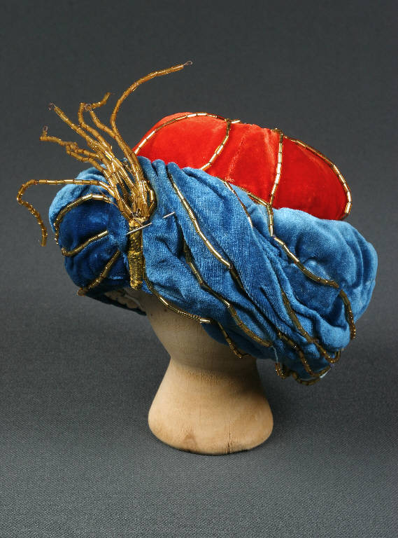 Il turbante con base di fibra di velluto arancione, nella calotta, azzurro, nella fascia, è decorato con piccole canoutilles dorate infilate su fili azzurri e fissate sulla sommità e all'intorno. Posteriormente sono infilate su filo di ferro sottile e formano una sorta di pennacchio con base avvolta in nastro laminato oro.