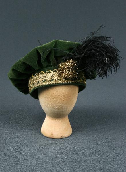 Il cappello è composto da una fascia di cartoncino rivestito di velluto verde, decorato con passamaneria oro, alla quale è cucita una calotta di velluto verde foderata con tela grigia. Sono applicati un pon pon di filo laminato oro e una penna nera di struzzo.