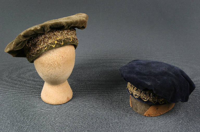 I cappelli, foderati con tela chiara e grigia, sono composti da una calotta e da una fascia di cartoncino rivestito di velluto rispettivamente di colore verde marcio e blu decorata con passamaneria oro.