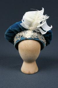 Il cappello di velluto azzurro, foderato con tela chiara, è composto da una fascia e da una calotta più larga. La fascia è realizzata in cartoncino rivestito di velluto azzurro ed è decorata con passamaneria argentata sulla quale è cucita una penna bianca.