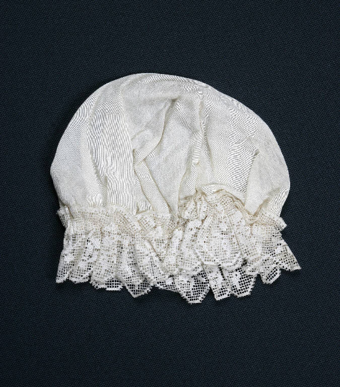 Cuffia di tessuto di cotone bianco bordata alla base con pizzo.