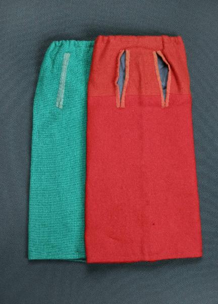 Le due vesti sono realizzate in tessuto di lana verde e rossa e sono foderate con tessuto grigio. Le aperture per le braccia sono bordate rispettivamente con traversino verde e rosso.