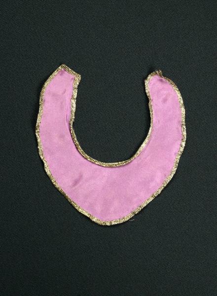 Il colletto di forma ovale è realizzato in raso lilla, con fodera chiara, ed è bordato con nastro laminato argento.