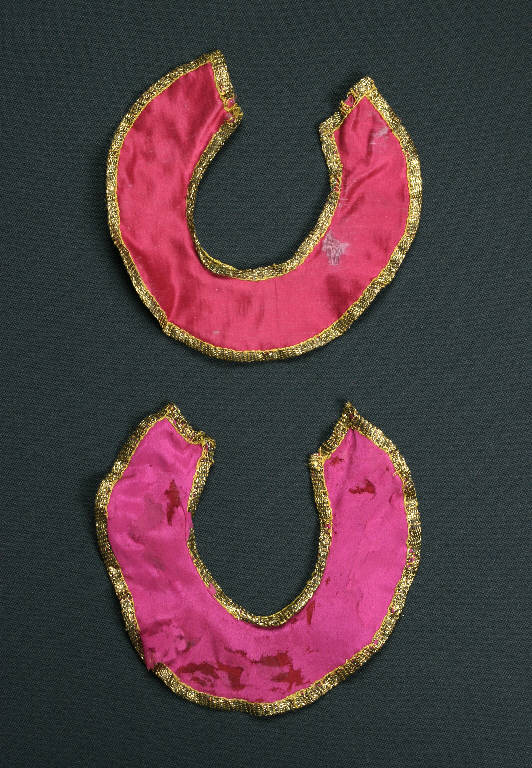 Colletti tondi di seta double face bordati con nastro laminato oro. Il primo colletto è di seta rossa da una parte e verde dall'altra; il secondo è rosso e fuxia.