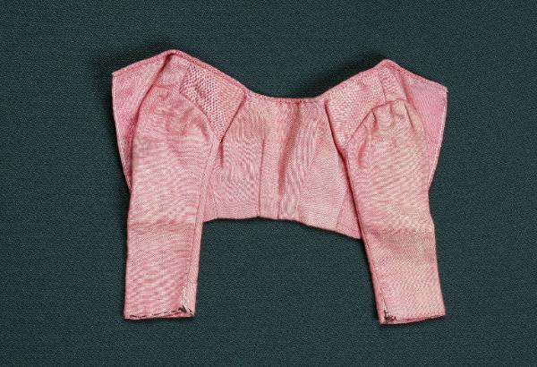 Il corpetto è di tessuto rosa con fodera di cotone a righe orizzontali grigie.