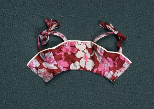 Il corpetto con bretelline è realizzato in seta rossa e viola con disegni floreali stampati ed è bordato con nastrino rosa.