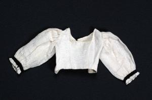La camicetta è di tela bianca con scollatura quadrata e maniche a palloncino bordate ai polsi con nastrino nero.