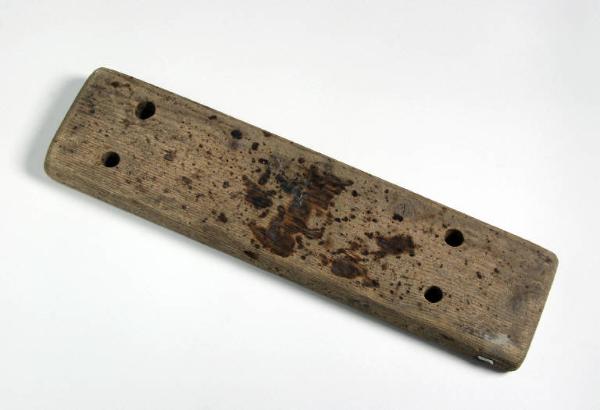 La tavola di legno, rettangolare con quattro fori, fungeva da supporto per sttue di scena.