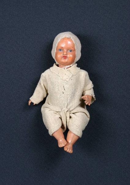 Il bambolotto è di celluloide di produzione industriale, realizzato con uno stampo. Presenta due fossette sulle guance, capelli modellati, sopracciglia marroni, occhi neri e azzurri, bocca aperta dipinta di rosso e due dentini visibili. La testa è articolata nel collo, le braccia e le gambe sono articolate al busto e prive di snodi. Il bambolotto indossa un pagliaccetto di cotone a quadretti bianchi e blu sul quale è infilata una maglina di lana fissata sul davanti con uno spillo. All'altezza del collo è stato ricavato un risvolto cucito con grossi punti. Sulla testa calza una cuffia di lana chiara.