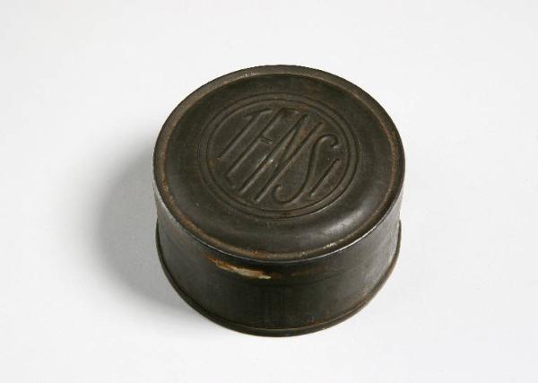 La scatola è di metallo, rotonda, con scritta stampata. Contiene paillettes metalliche piccole e medie.