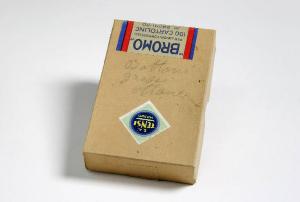 La scatola è di cartone marrone con etichetta incollata "S.A. SENSI MILANO" e "BROMO" nei colori giallo e blu; lateralmente e sulla faccia superiore scritta a matita "Bottoni grossi ottone". La scatola contiene un numero imprecisato di bottoni, alcuni lisci, altri sbalzati con corone e ali.