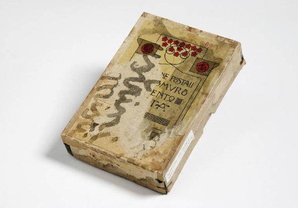 La scatola è di cartone beige con angoli rinforzati con carta nera, con etichetta strappata sul coperchio della quale si intuiscono poche lettere. E' presente una scritta a pennello: "Lustrini misti". La scatola contiene paillettes di metallo dorate e un pacchettino con paillettes più piccole.