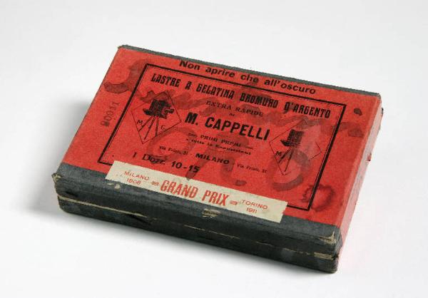 La scatola è di cartone scuro con etichetta rossa incollata e varie diciture a stampa. Un'altra etichetta di carta bianca reca la scritta "Milano 1906 GRAN PRIX Torino 1911". La scatola contiene paillettes dorate di metallo con foro centrale.
