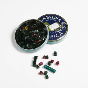 La scatola, rotonda, è di metallo azzurro con scritta bianca su fondo blu sul coperchio. La scatola contiene un numero imprecisato di tubicini di vetro verdi e rossi.