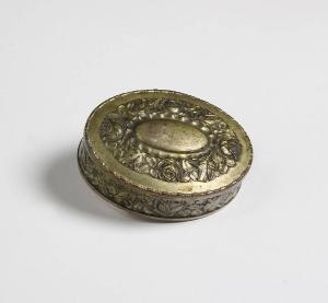 La scatola, ovale, è di metallo sbalzato con motivi floreali intorno e sul coperchio, con cerniera. La scatola contiene un numero imprecisato di perline bianche, rosa, dorate, blu sfaccettate, nere con strass, di madreperla rotonde e grige.