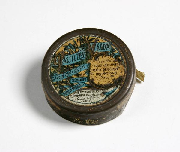 La scatola rotonda è di metallo con etichetta incollata sul coperchio. Contiene un numero imprecisato di piccole borchie concave di ottone.