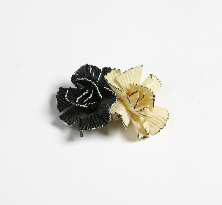 Due decorazioni in forma di fiori in plastica, l'uno bianco con petali screziati di nero alla sommità e uno nero con screziature bianche.