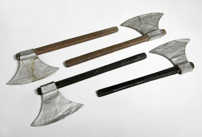 Quattro accette di burattino, con manico di legno dipinto, due marroni e due neri. Le lame, inchiodate ai manici e formate da due lamine uguali sovrapposte, sono in lamiera dipinta con vernice argento.