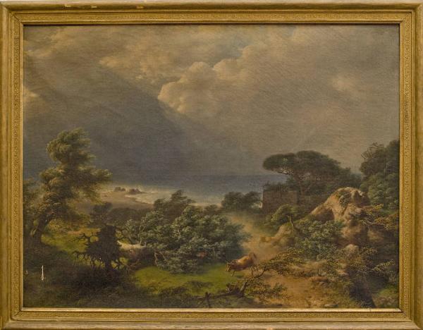 - NOTIZIE STORICO CRITICHE La tela pervenne a Brera nel 1889 con il legato Ala Ponzoni. Esposta alla rassegna braidense del 1842, venne commentata così: "(...) la bellezza delle pinate, l'armonia, l'aria, il vapore, che vi gira fanno sorpassare qualche durezza (...)". Come consuetudine delll'artista, il dipinto, rappresentante l'arrivo di un temporale, si sviluppa sul basso della tela: quì, tra le piante abbassate violentemente dal vento, al centro della scena si nasconde una cosiddetta "scena di genere" (di ascendenza fiamminga), ovvero l'episodio dell'uomo travolta dall'albero, mentre un forte fascio di luce illumina da sinistra la composizione.