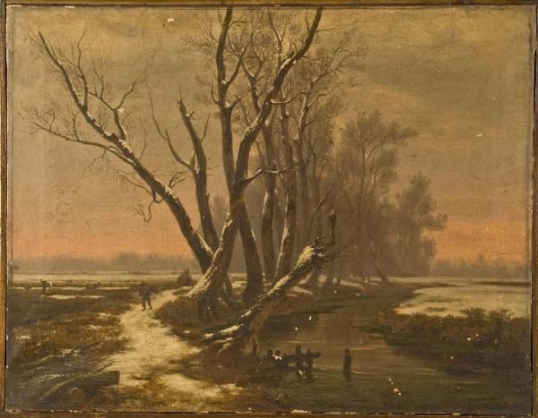 - NOTIZIE STORICO CRITICHE Il Corvini partecipò, sin dal 1845, alle rassegne espositive torinesi e milanesi. La tela è un tipico esempio della pittura dell'artista milanese che, già in occasione della mostra braidense del 1859, esponeva "una prateria lombarda in tempo d'inverno ben espressa e ben definita". Questo tipo di paesaggio rispondeva, infatti, al gusto della committenza data la frequenza con la quale vengono proposti, anche se, già nel 1853, "Le Gemme" criticamente si domandavano se "questi soggettini bastardi nè fiamminghi, nè italiani (...) accennano essi la fatuità dei committenti o l'inettezza degli artisti?".