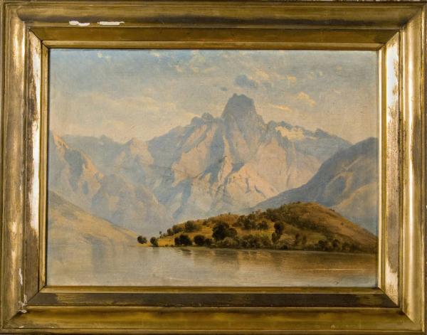 - NOTIZIE STORICO CRITICHE La veduta del Prinetti, rappresentante uno scorcio del lago di Como, in particolare le sponde ove sorge il paese di Colico, riprende il medesimo punto di vista di un'incisione di Pietro Bertotti, "Monte Legnone ed il forte di Fuentes", pubblicata a Milano su "La lombardia pittoresca" fra il 1835 e il 1838. Rispetto all'opera di Bertotti, quì però mancano le rovine del forte e la burrasca sul lago: Prinetti, infatti, immortala la natura pacifica e serena del lago. La tela, proposta all'Esposizione di Brera del 1855 come "studio dal vero" andrebbe però collocata intorno al 1853 sia per la resa pittorica con cui è condotta, assimilabile ai modi del naturalismo romantico di Julius Lange (1851), che per l'ascedenza diretta dalla pittura di Canella. Già nel 1853, il Prinetti godeva di larghi favori da parte della critica, tanto da essere sempre presente sulle pagine delle pubblicazioni coeve, come dimostrano i numerosi interventi sulle pagine de "Il Crepuscolo", "Le Gemme", l'"Album" o in "Guida Critica".