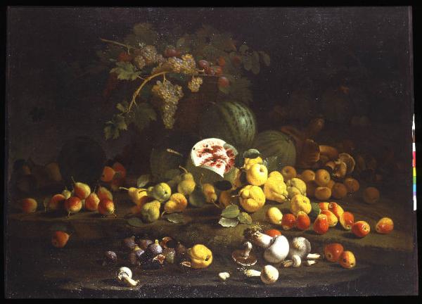- NOTIZIE STORICO CRITICHE L'opera dovrebbe fare da pendant de "Natura morta con zucche" di Rizzi Marco Antonio. Nel 2000, in occasione della mostra "Fasto e rigore. La natura morta in Italia settentrionale dal XVI al XVII secolo", si attribuirono le tele al pittore Rizzi Marco Antonio.