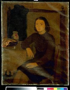 - NOTIZIE STORICO CRITICHE Le etichette presenti sul retro della tela, non solo ci informano che il dipinto venne presentato in occasione della III Mostra del Sindacato Nazionale Fascista di Belle Arti, ma anche che cooncorreva per il premio Canonica di quell'anno. La tela, risultata vincitrice, rappresentante il ritratto della moglie dell'artista, è evocativa dell'accostamento dell'artista all'esperienza secessionista di Ca' Pesaro cui si avvicina nel 1935 dopo l'incontro di Pio Semeneghini e Vellani Marco a Burano. Il dipinto, essenziale dal punto di vista compositivo, è caratterizzato dalle forme semplici dei volumi e dalla pulizia quasi schematica dei contorni in un'atmosfera quasi metafisica.