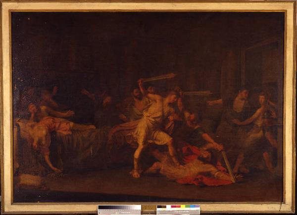 - NOTIZIE STORICO CRITICHE Il dipinto venne presentato all'Esposizione di Brera nel 1805 per il Concorso di II classe, il cui bando venne pubblicato l'anno precedente. Come da regolamento, la tela doveva rappresentare il capitolo 23 dell'"Orestiade" di Luciano, in particolare il momento in cui Pilade il Focese ed Oreste, dopo aver ammazzato Clittenestra, scatenavano la loro ira su Egisto davanti alla corte già costernata dall'orrendo assassinio. L'opera venne proclamata vincitrice, anche se la commissione esprimeva delle riserve "nel disegno, nello stile e nel decoro" con cui era stata condotta. In questo mediocre lavoro, gli espedienti vòlti a sottolineare la drammaticità dell'azione (luce radente, gioco espressivo di braccia e volti), falliscono per l'inesperta contrapposizione di ombre e luci.