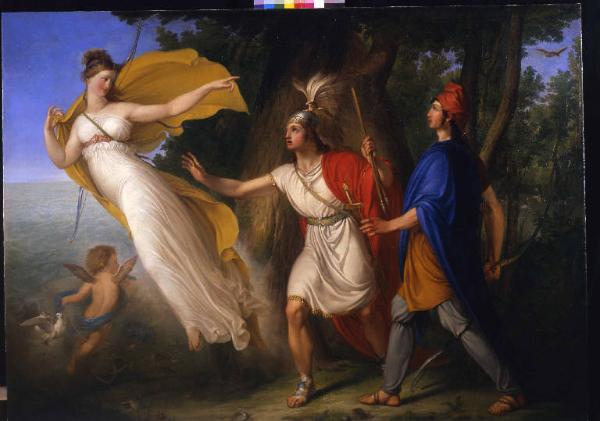 Venere in forma di cacciatrice compare ed Enea sui lidi della Libia. Venere appare a Enea come cacciatrice